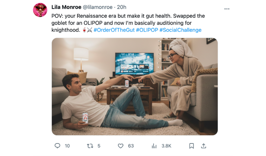 OLIPOP drops weekly social challenges, like asking fans to recreate iconic Renaissance paintings but swap the goblet for an OLIPOP. Each challenge completed earns points in OLIPOP on the Rewards website, bringing fans closer to unlocking the Great OLIPOP Knighthood Drop. Along the way, they score perks like coupons, early drops, and limited-edition rewards.